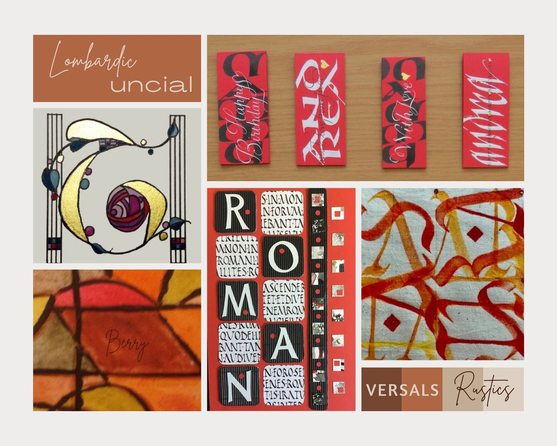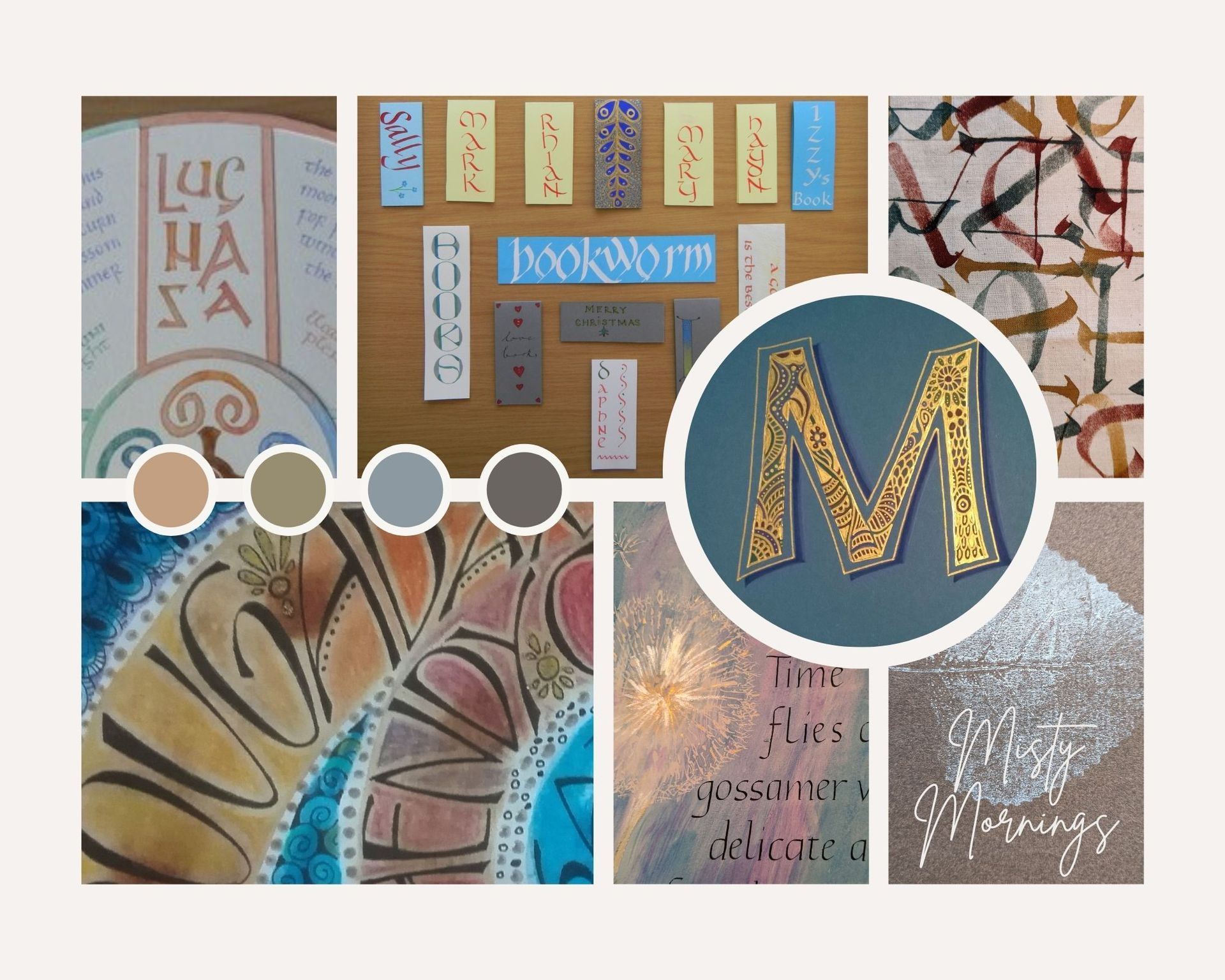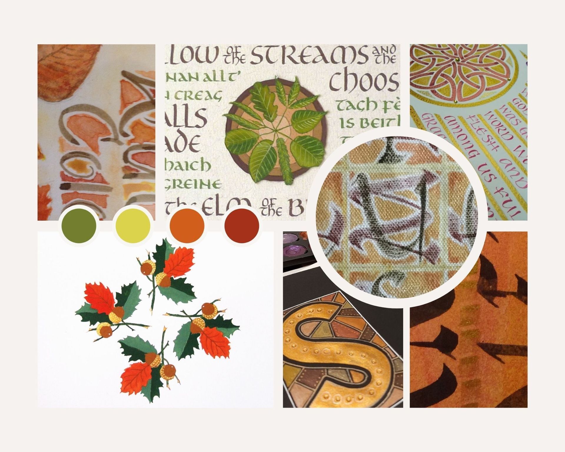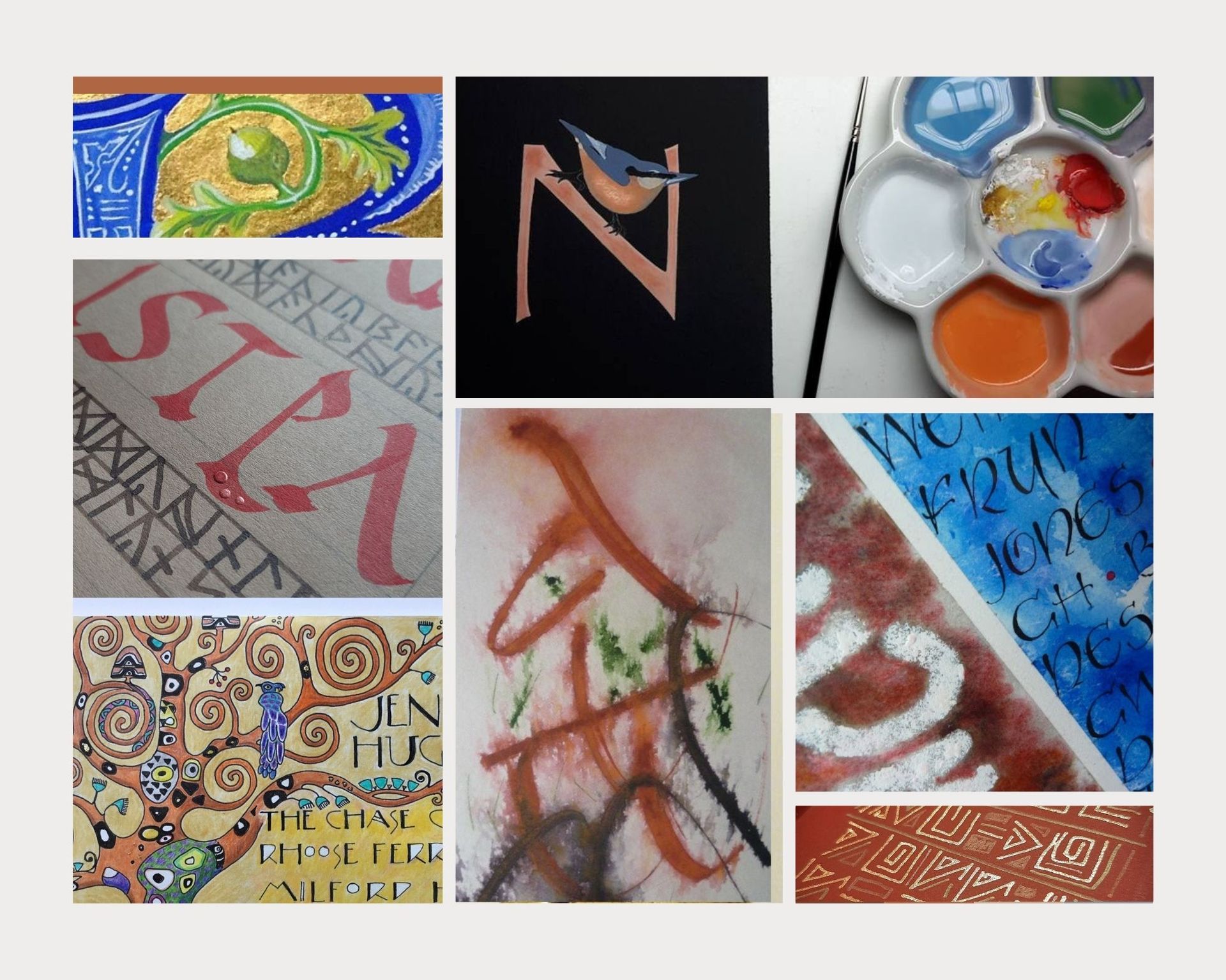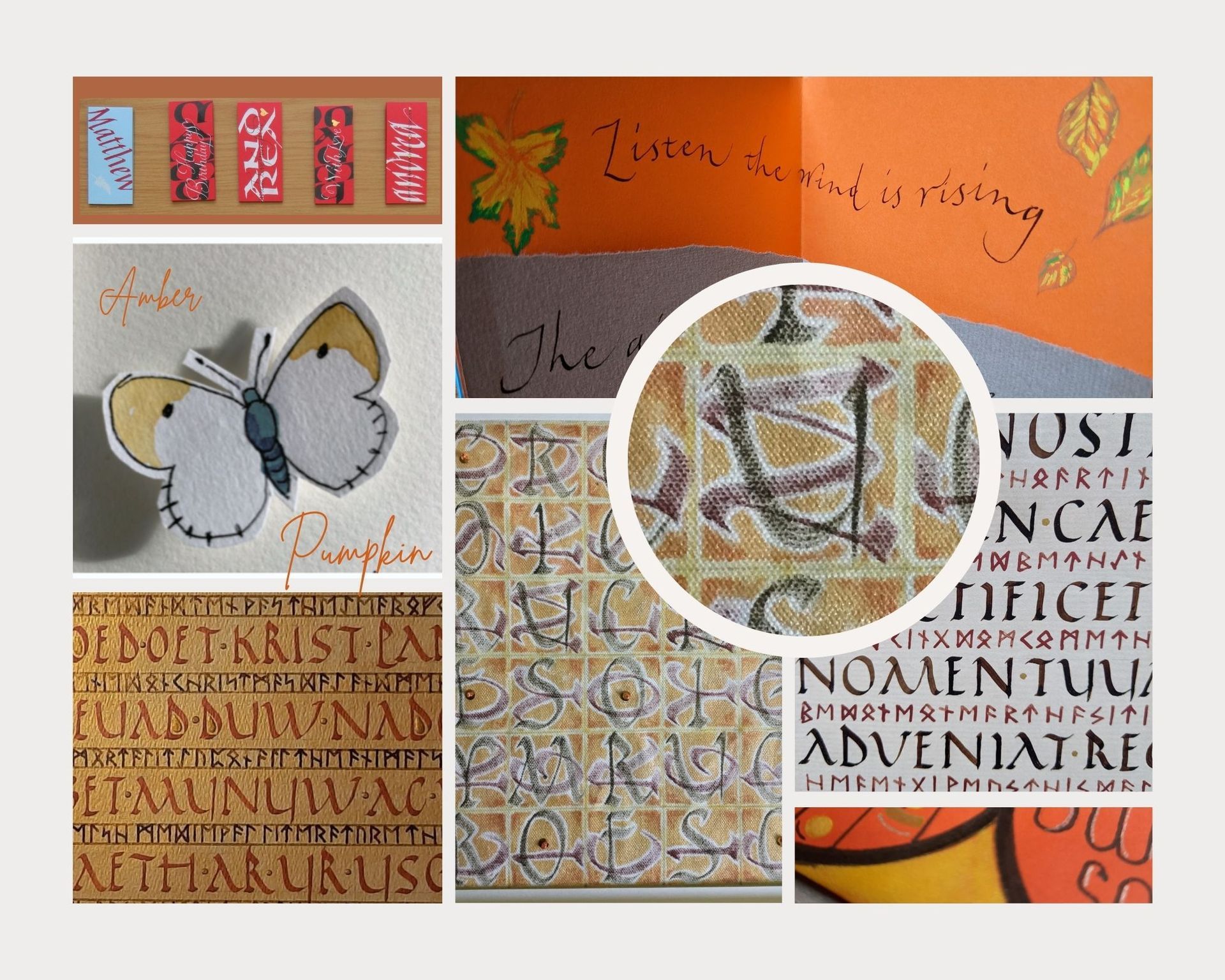 Our autumnal collages feature a wide variety of creative work using different media for written hands, drawn lettering, illumination and gilding. We hope they provide you with some inspiration for your own ongoing work. One advantage of the longer, darker nights is perhaps more time to settle down to some creative calligraphy without the distraction of good weather or the smell of a BBQ outside!